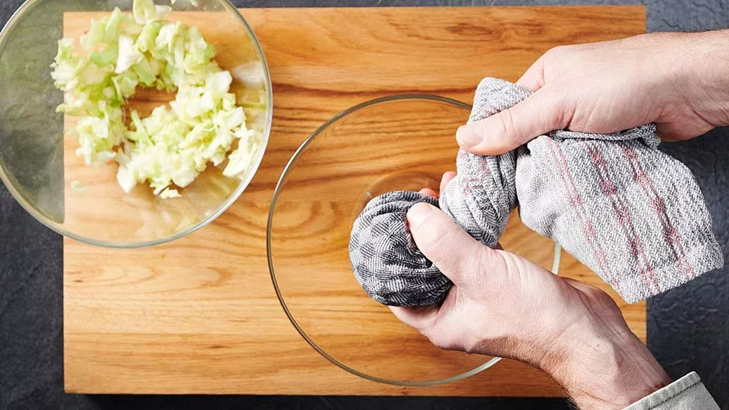 Skyl og rens spidskålen. Hak den groft, og drys med 1 tsk. salt. Ælt kålen godt i hånden. Pak den hakkede spidskål ind i et viskestykke, og vrid den hårdt, så væsken kan dryppe fra.