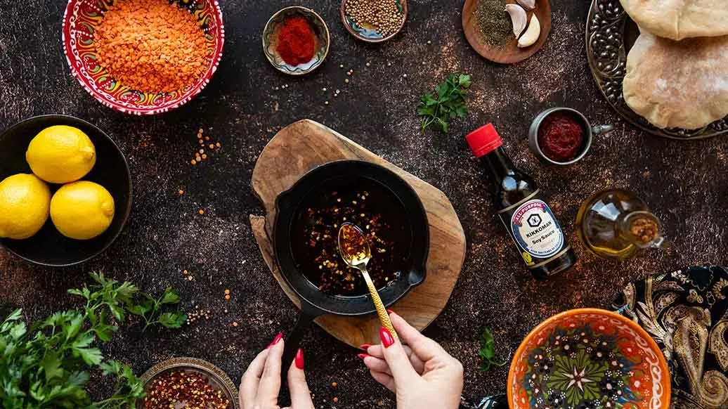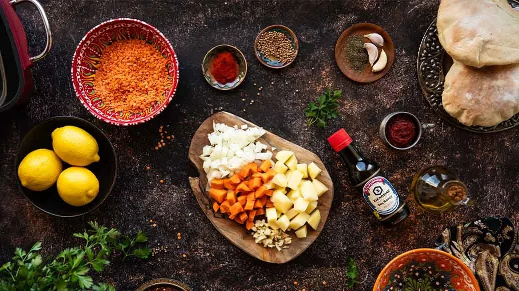 En hyggelig suppe af røde linser, gulerødder, kartofler og hvidløg, simret med krydderier og tomatpuré. Kikkoman sojasauce sørger for en dyb umamismag, mens mynte, persille, chili og citron giver retten en frisk og livlig smag.