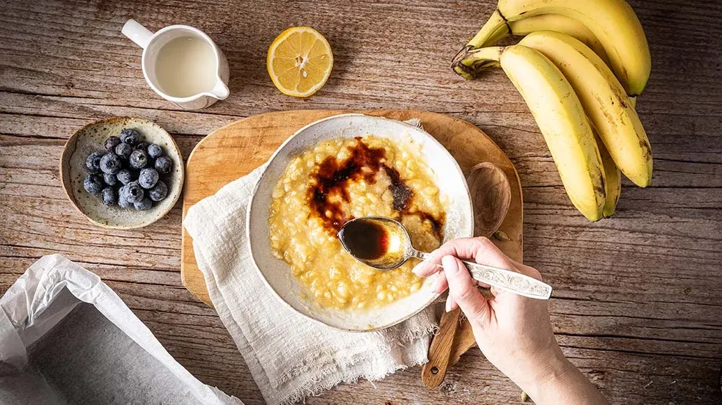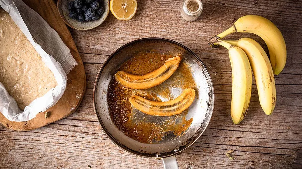 Opvarm kokosolie på en pande, og tilsæt ahornsirup og Kikkoman sojasauce med mindre salt. Læg de halve bananer på panden, og lad dem karamellisere i 1 minut på hver side.
