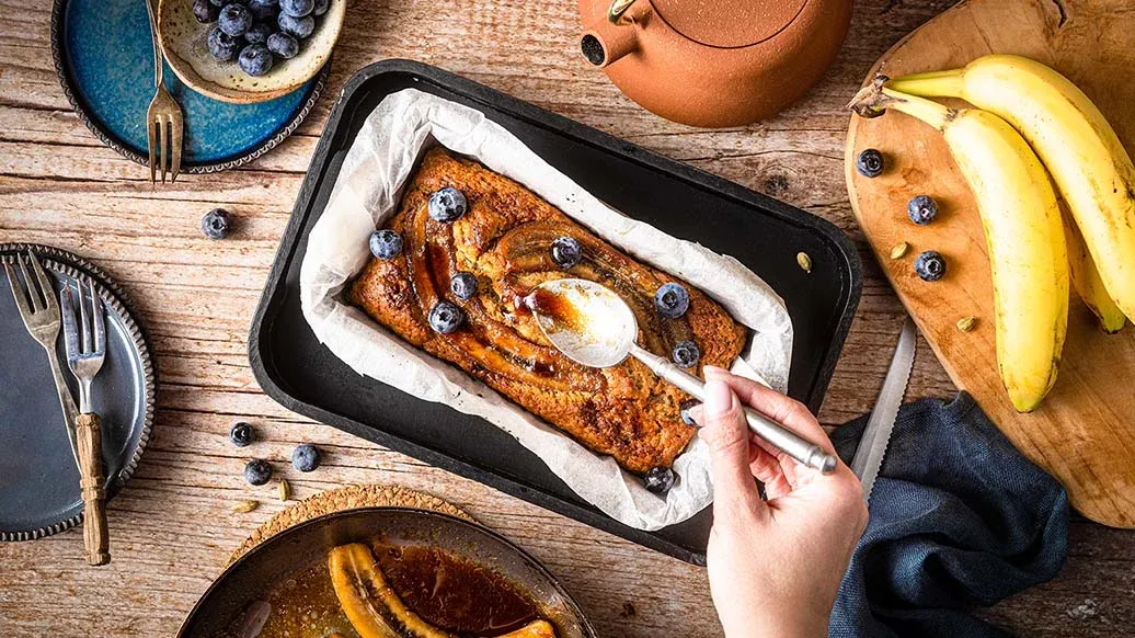 Anret de karamelliserede bananer oven på dejen, og dryp den resterende glaze fra panden hen over. Pynt med blåbær. Bag bananbrødet ved 180 °C i ca. 45 minutter. Lad bananbrødet køle helt af, før det skæres i skiver og serveres.