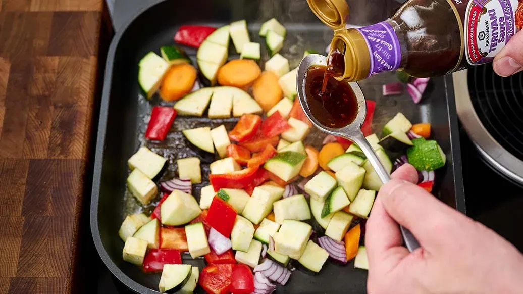 1 lille gulerod – 1 lille squash – 1 rødløg – 1 lille rød peberfrugt – 1 lille aubergine – 2 spsk. olivenolie – 3 spsk. Kikkoman Teriyaki Sauce med Ristet Hvidløg – Friskmalet peber