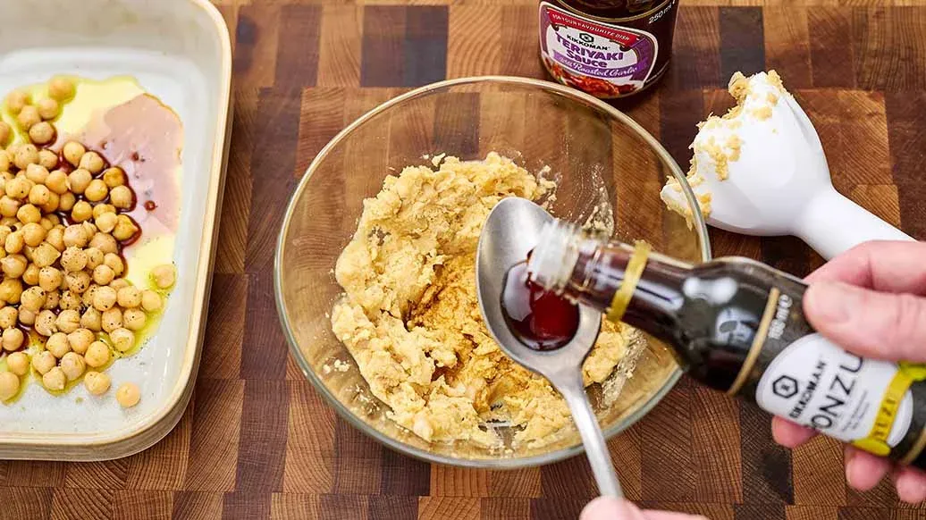 Forvarm ovnen til 200°C. Dræn kikærterne og purér halvdelen med 2 spsk. Kikkoman ponzu yuzu sojasauce og 2 spsk. vand. Læg de resterende kikærter i et lille ovnfast fad og bland dem med hørfrøolie, en smule peber og 1 spsk. Kikkoman teriyaki sauce med hvidløg. Bag dem i den forvarmede ovn i ca. 15 minutter.