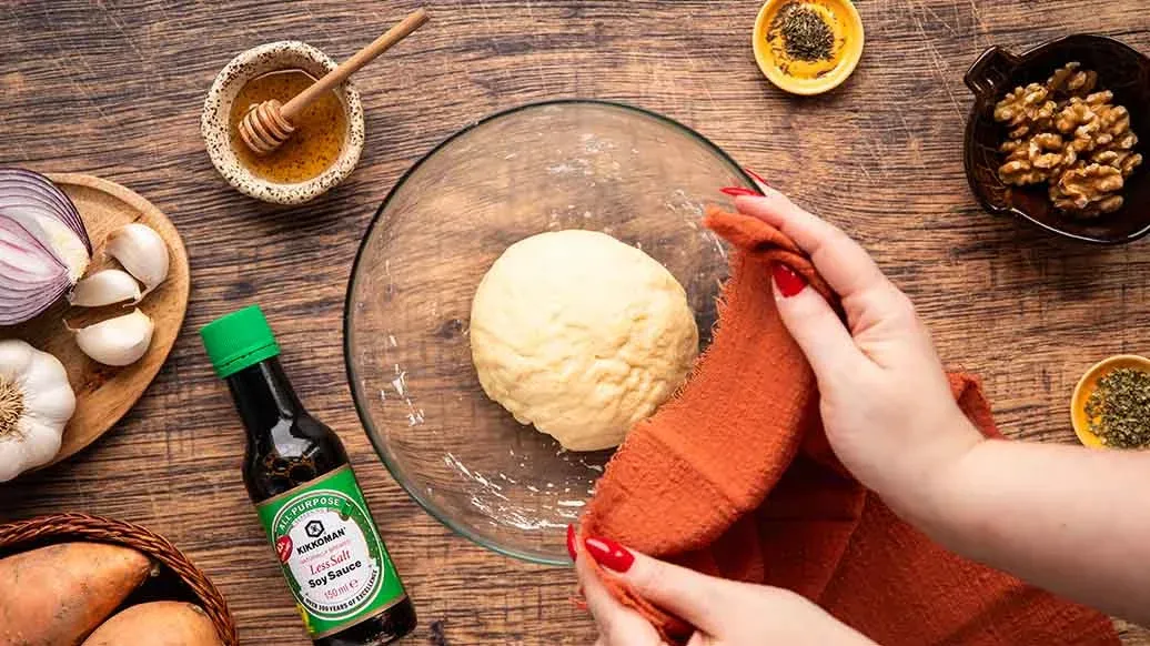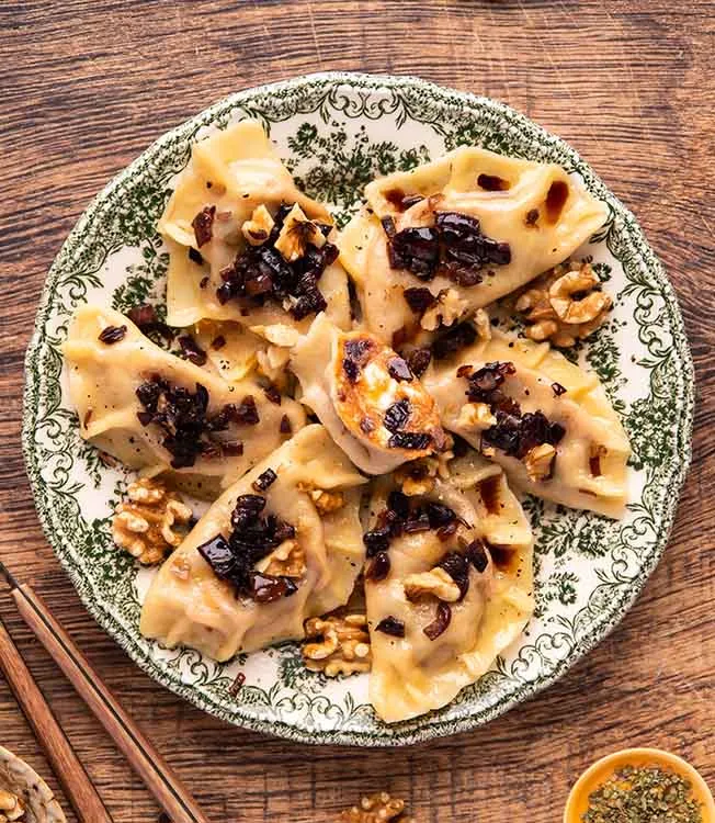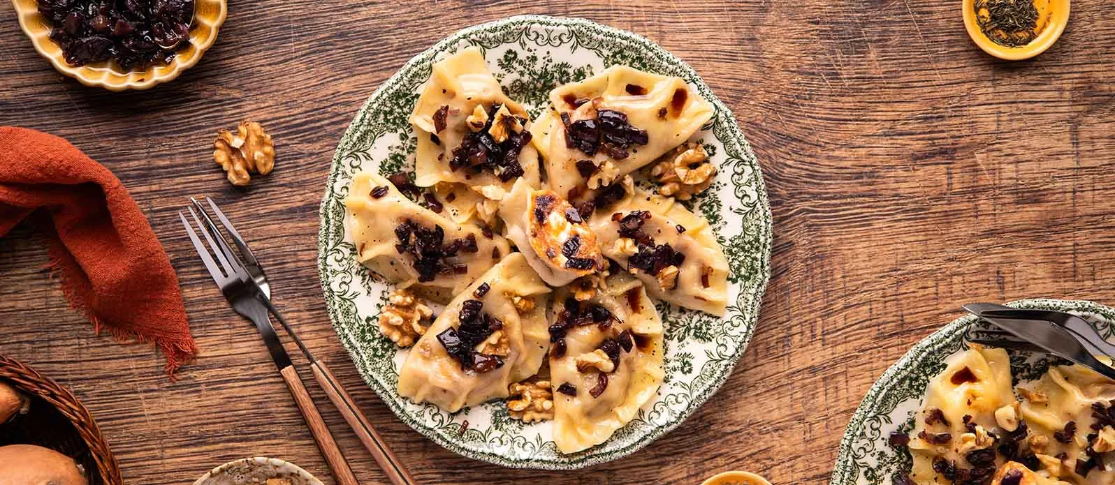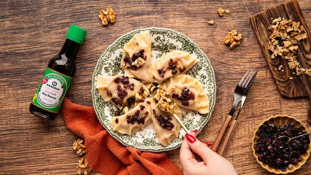 Pierogi med et twist – polske dumplings fyldt med søde kartofler, feta og karamelliserede løg. Et stænk Kikkoman sojasauce med mindre salt tilfører umamidybde, mens hakkede valnødder sørger for sprødhed i denne sødmefyldte, velsmagende ret.