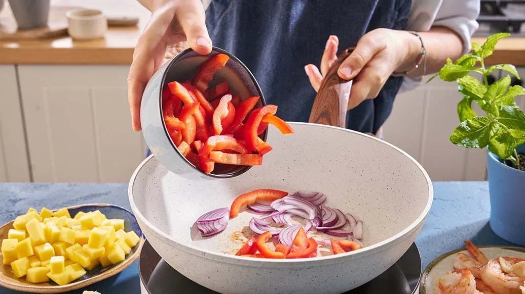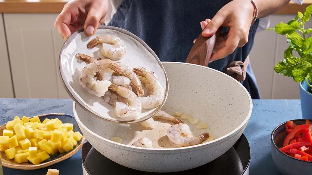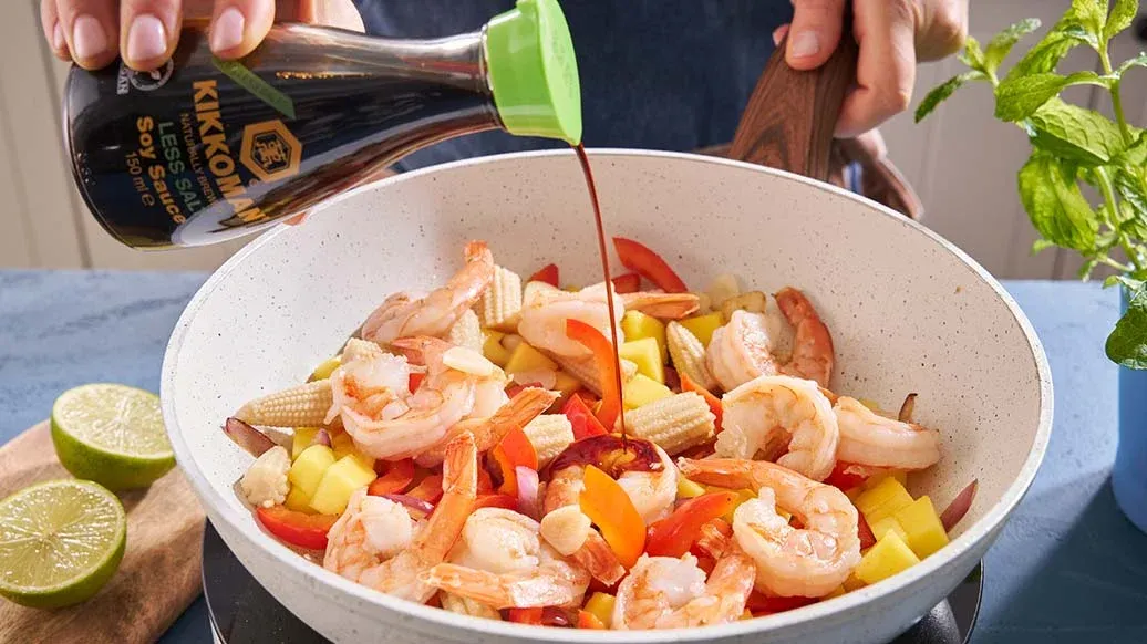 En farverig wokret med rejer, mango og lime. Retten gøres lækker med den dybe umamismag fra Kikkoman sojasauce med mindre salt og har en perfekt balance mellem friskhed og dybde i hver eneste bid.