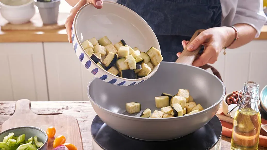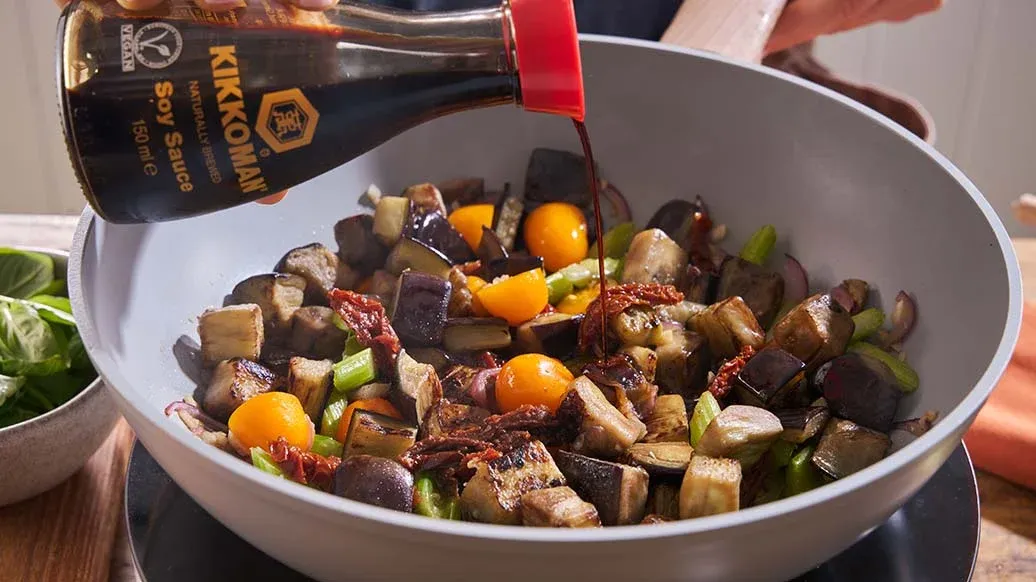 En livlig wokret, fyldt med Middelhavs-smage – røget aubergine, søde tomater og aromatisk basilikum - forbedret af den dybe umamismag i Kikkoman sojasauce.