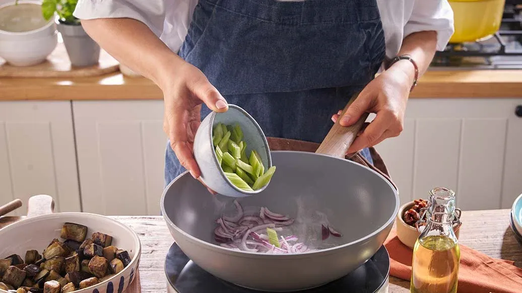 Opvarm olie i den samme wok, tilsæt løg, hvidløg og bladselleri, og steg det hele i 1-2 minutter.