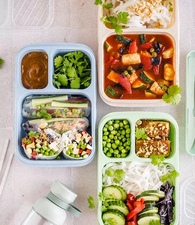 Skær grøntsagerne i skiver og læg dem i en madkasse sammen med tofu, kogte ærter, nudler og koriander.